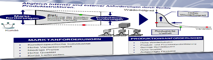 Innovative Produkte zu wettbewerbsfähigen Kosten schnell zu entwickeln sind die Anforderungen. Um in diesem Spannungsfeld auch weiterhin ein breites Produktspektrum bei konkurrenzfähigen Produktionskosten anbieten zu können, muss eine optimale Balance zwischen externer (Markt-) Vielfalt und interner (Produktions-) Varianz sichergestellt sein.